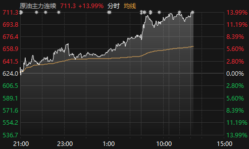 上证报中国证券网讯据Choice数据,3月5日,上期所原油期货主力合约盘中触及涨停,截至13:38报711.3元/桶,涨13.99%。