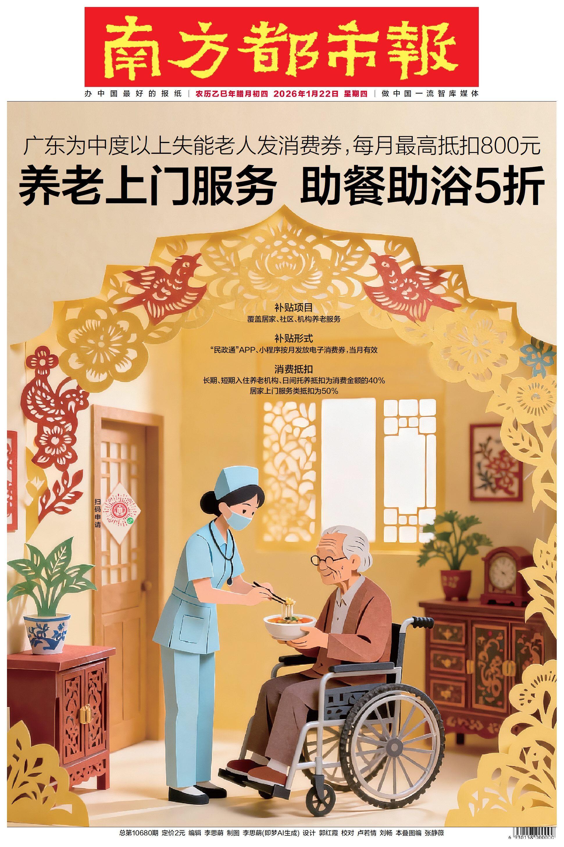 日前,广东省民政厅、省财政厅联合印发《广东省向中度以上失能老年人发放养老服务消费补贴项目实施方案》。根据方案,广东将为符合条件的失能老年人发放电子消费券,每人每月最高可抵扣800元,初步实施期限为2026年1月至12月。本次补贴政策将推动减轻失能老年人家庭照护负担,更好满足失能老年人照护服务刚需。符合条件的老年人可通过“民政通”(含小程序、APP)进行申请。