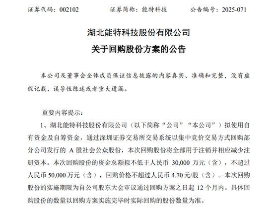 一方面,能特科技拟使用自有资金及自筹资金,以集中竞价交易方式回购部分公司发行的A股股份,资金总额为3亿元至5亿元,回购价格不超过4.70元/股(含),回购的实施期限为股东大会审议之日起12个月内。